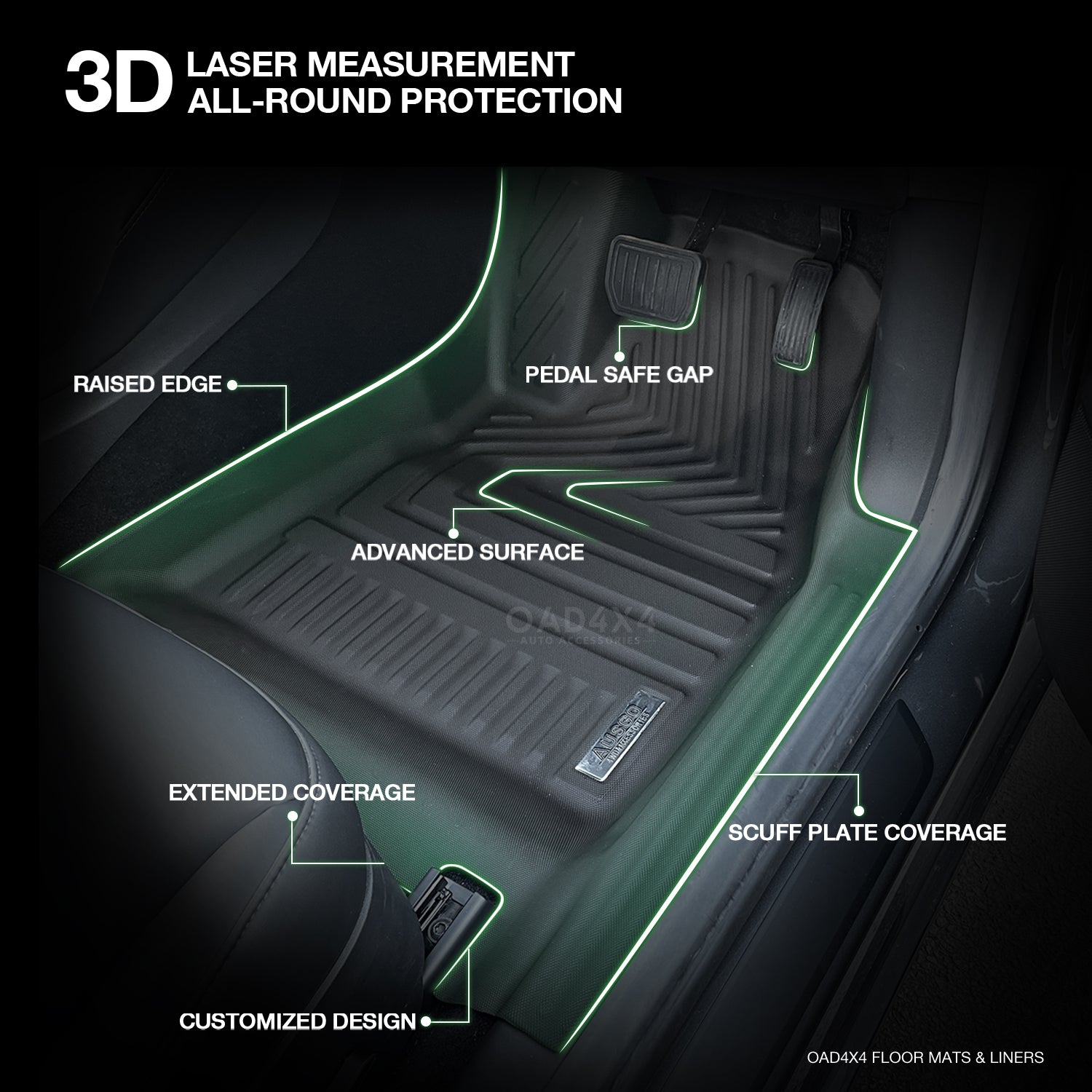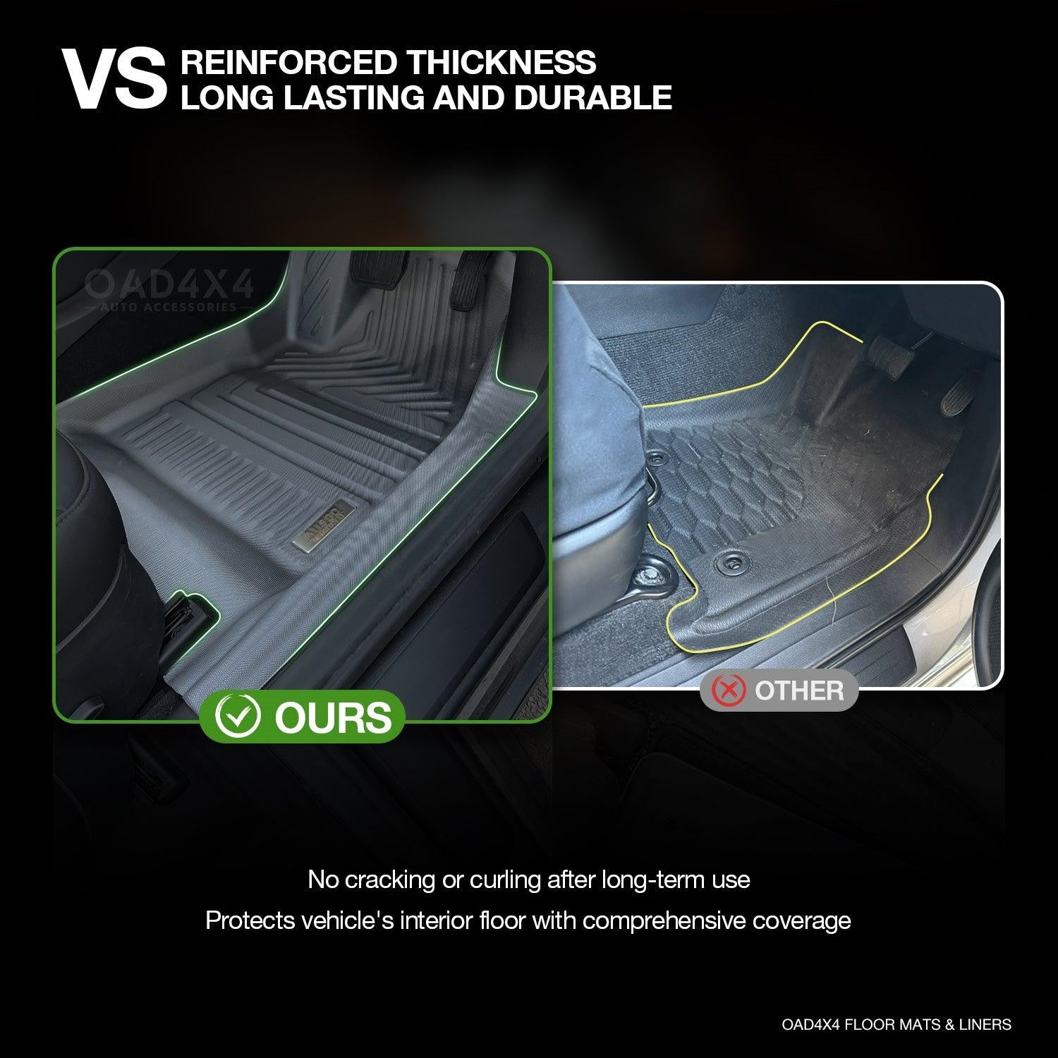 OAD4X4 floor liners are made from premium-grade TPE (Thermoplastic Elastomer), a high-performance material that combines the flexibility of rubber with the strength and durability of plastic, offering excellent resistance to water, dirt, wear, and harsh weather.