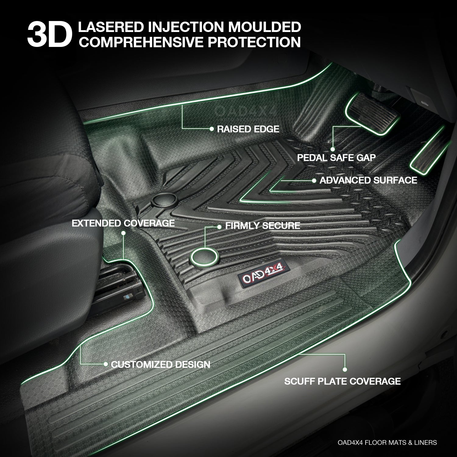 OAD4X4 floor liners are made from premium-grade TPE (Thermoplastic Elastomer), a high-performance material that combines the flexibility of rubber with the strength and durability of plastic, offering excellent resistance to water, dirt, wear, and harsh weather.
