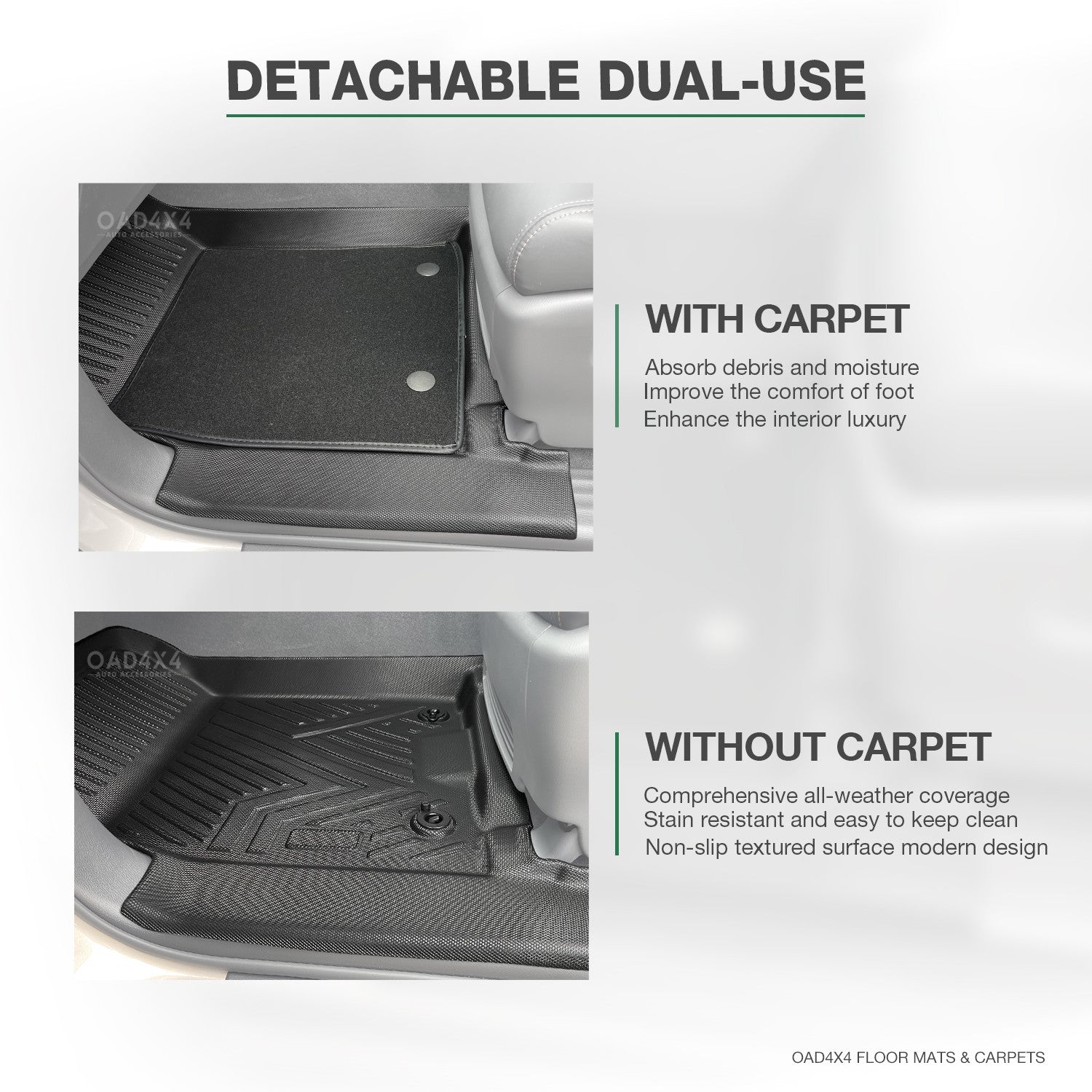 • Dual-layer Advantage: The TPE base provides all-weather protection, while the detachable carpet top adds both comfort and refined style.